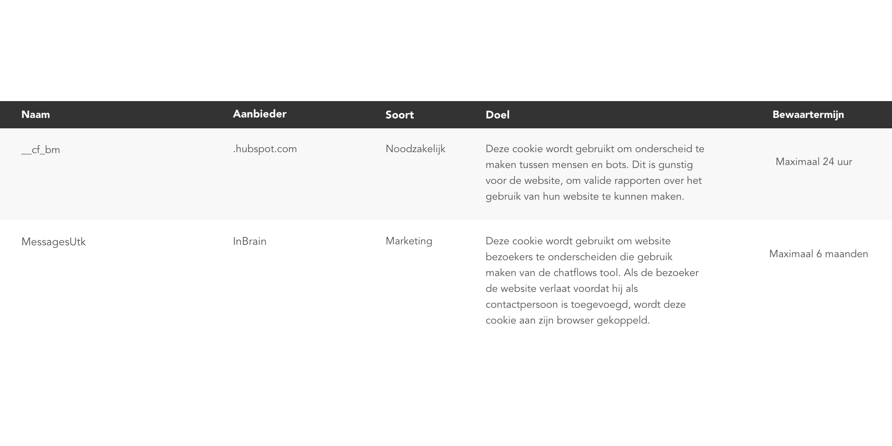 In onderstaande tabel vind je een overzicht van de cookies die wij gebruiken.